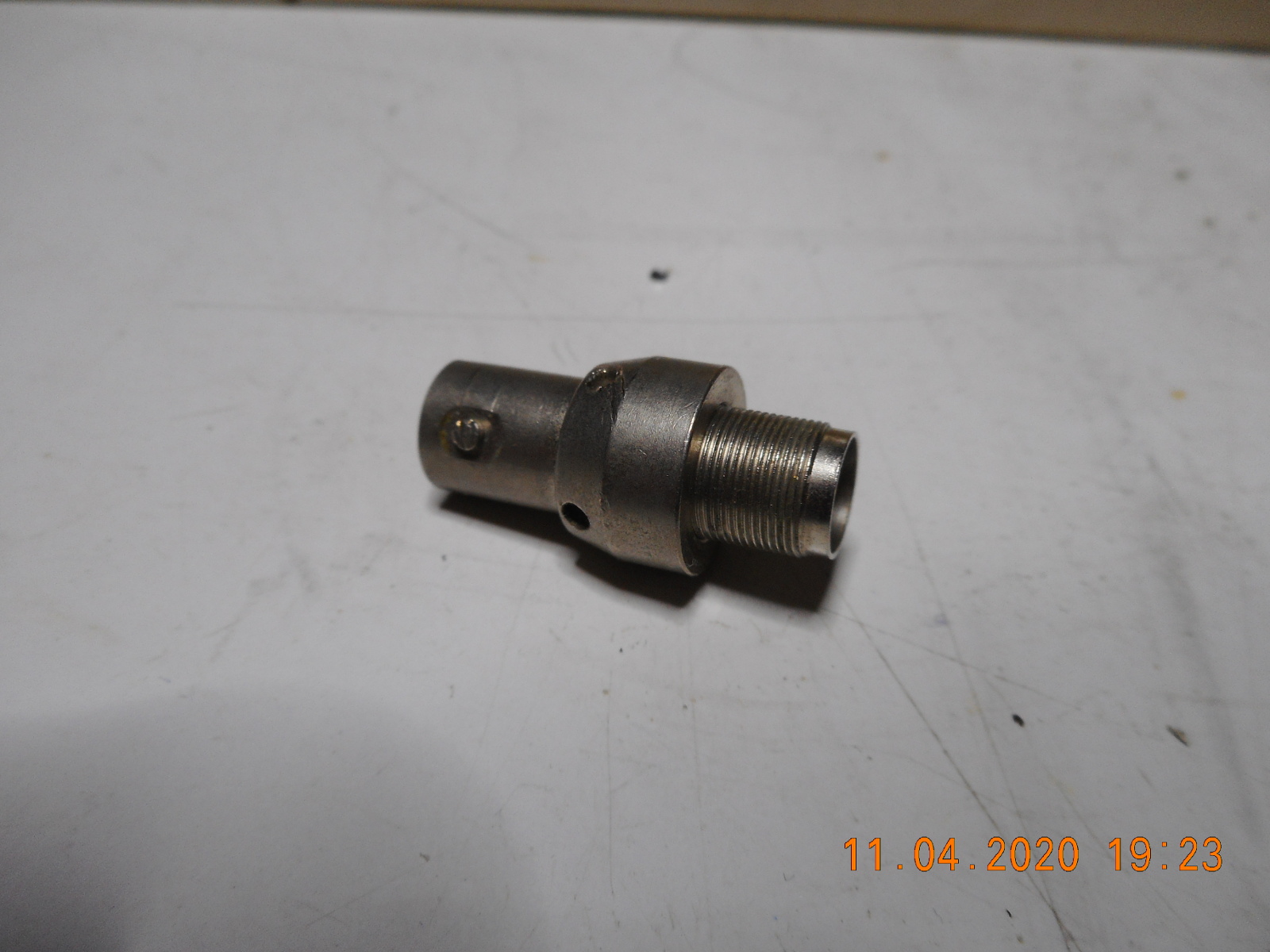 Foto 5. L'adattatore con cui l'SPM-14 è arrivato nel laboratorio del Beppe, appoggiato sulla sua maniglia sinistra e uno zoom ancora più ravvicinato sul connettore Versacon montato su di esso. Dal catalogo scaricabile dal link nella didascalia della Foto 3, uno può arricchire la propria cultura con l'informazione che quello è un adattatore Versacon-2,5/6 (DIN 47 296). No, non è un adattatore Versacon-N, anche se a prima vista potrebbe sembrarlo. |