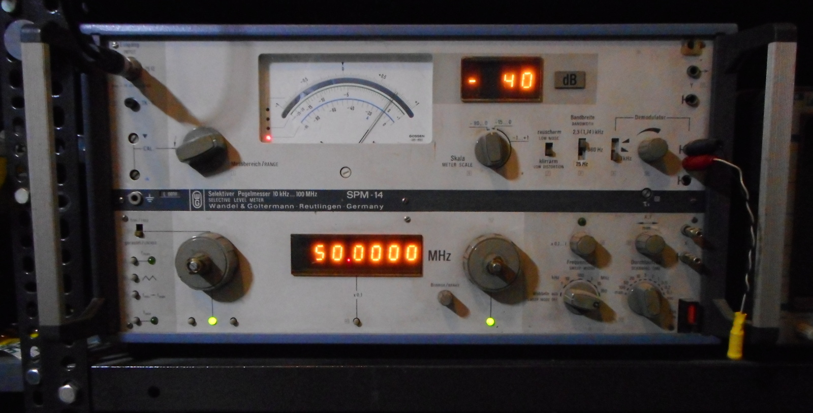 Foto 1. Il voltmetro selettivo Wandel & Goltermann SPM-14. In basso è visibile quello che credo essere il "Control Oscillator" RWO-14, mentre l'apparato nella parte superiore del cofano è il voltmetro selettivo vero e proprio, che forse si chiama PM-14. Si nota infatti che la scritta "SPM-14" si trova sul cofano che racchiude i due apparati. Non ho idea di che combinazione sia questa, perché nella scarsa documentazione che ho questo caso apparentemente non è contemplato, come si può vedere nella Foto 2. Questa fotografia è il festival degli strumenti d'epoca, perché il segnale che l'SPM-14 sta misurando è generato dal Marconi TF2015. Se vi state chiedendo che display siano mai quelli presenti, sono sì dei display a 7 segmenti, ma non a LED. Ogni segmento è realizzato con un piccolo filamento rettilineo tipo lampadina. È un vero miracolo che dopo tanti anni tutti i segmenti siano ancora buoni. Parecchi display a LED o a LCD sono durati molto meno. |