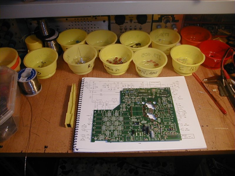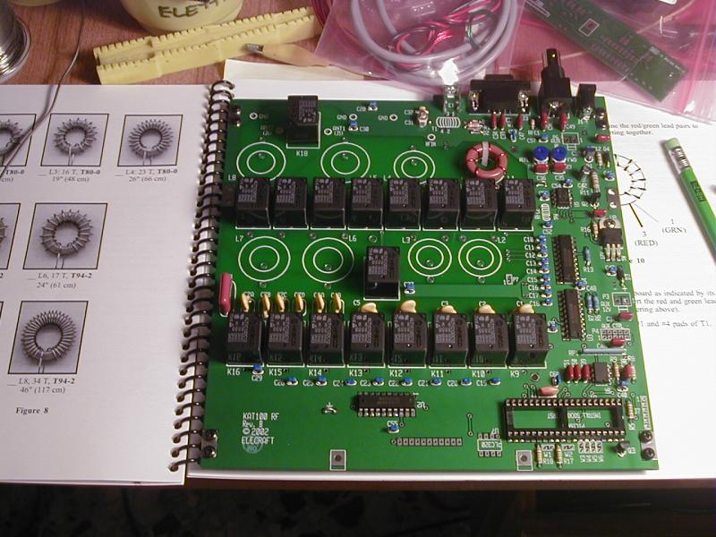 Primo intermezzo: l'inizio di una nuova avventura.Aperti i consueti sacchetti, disposti i componenti nei soliti contenitori ex-granita ed aperto il manuale, siamo pronti a iniziare la costruzione del KAT100-1. Nella foto vedete la scheda RF del KAT100-1 con un po' di componenti montati sopra. Mancano ancora quasi tutti gli induttori, che, essendo costruiti su nuclei toroidali di generose dimensioni (tanto da doverli fissare allo stampato con una fascetta) e con filo alquanto grosso, come si può notare dall'unico già presente, sono piuttosto faticosi da avvolgere. Si nota una quantità industriale di relè, necessari per commutare le varie L ed i vari C in modo da realizzare una L ed un C variabili su 256 passi ed a scegliere la configurazione delle stesse. Il KAT100 usa infatti una configurazione a L in cui il C deve essere posto all'ingresso oppure all'uscita a seconda se ROUT < RIN o viceversa. Il KAT100 comprende inoltre un commutatore per selezionare una delle due antenne ad esso collegabili, il che richiede un ulteriore relè. In totale, come chiunque sappia contare può vedere da sé senza che glie lo dica io, i relè sono 18 (otto per comutare le L, otto per commutare i C, uno per scegliere se C è collegato all'ingresso oppure all'uscita e uno per commutare le antenne. Come disse un illustre piemontese, l'aritmetica non è un'opinione. |